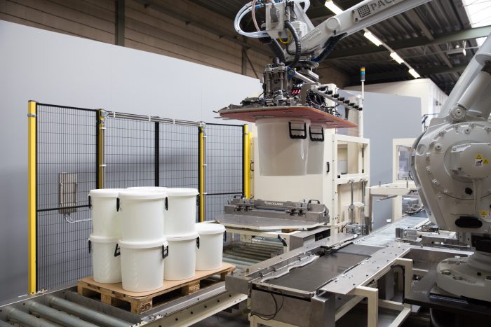 De Packland Robot Palletiser is de oplossing voor het palletiseren van emmers, trays, dozen, blikken, etc. Packland maakt gebruik van de ABB IRB 660 4-assige robot. Deze robot, met een capaciteit van 180 – 250kg, in combinatie met een door Packland ontwikkelde grijperkop maakt een efficiënte palletiser.