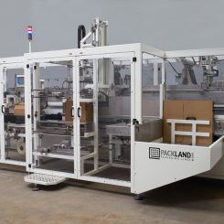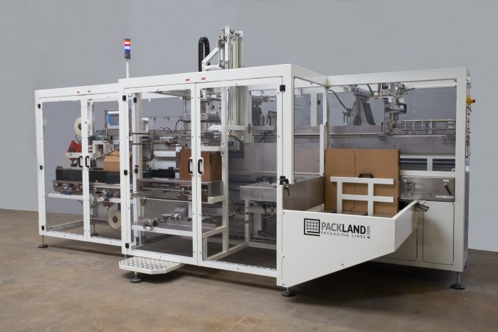 De volautomatische Packland Pick & Place PP6 / CE verpakkingsmachine verpakt blikken, emmers, flessen, jerrycans, doosjes, etc. in Amerikaanse vouwdozen.